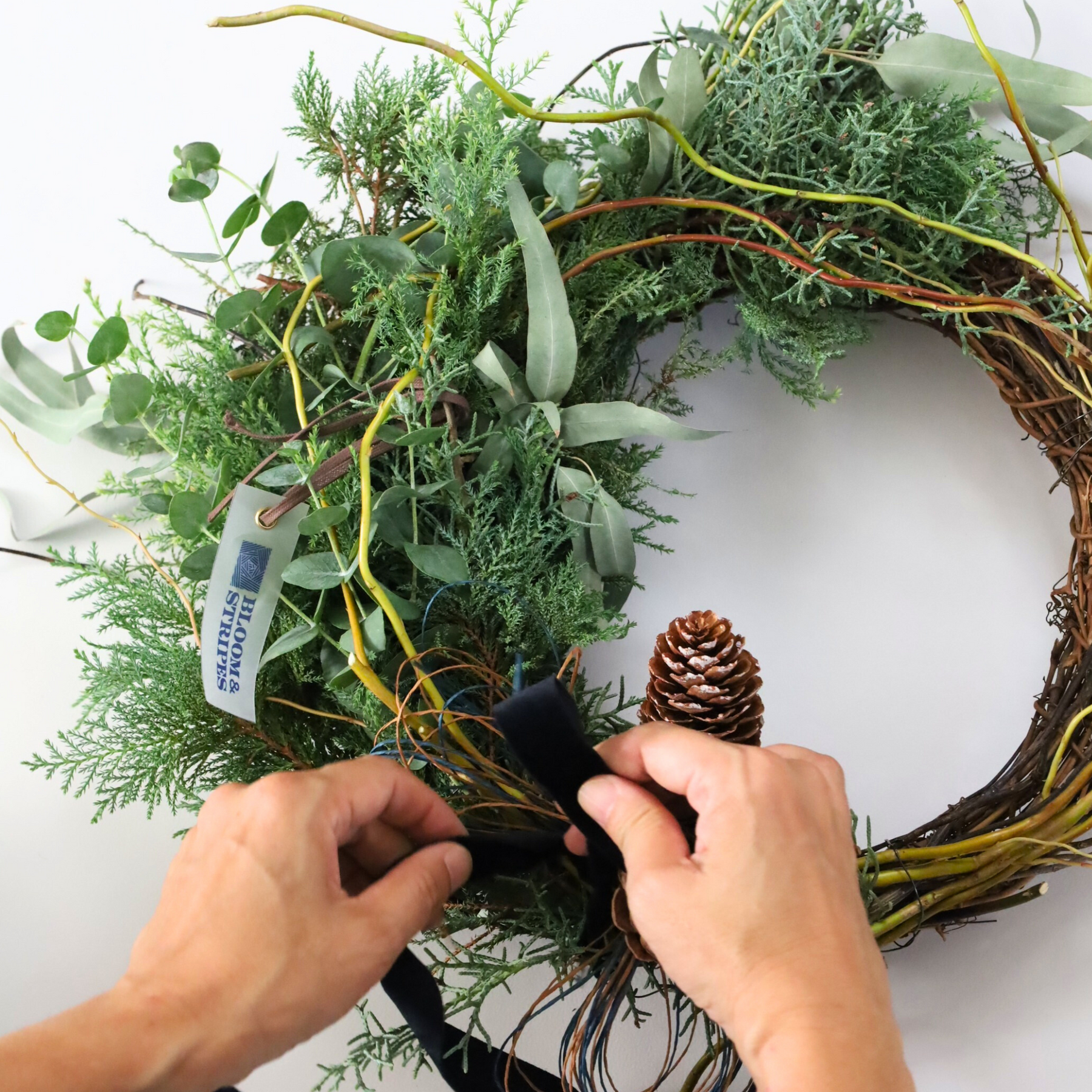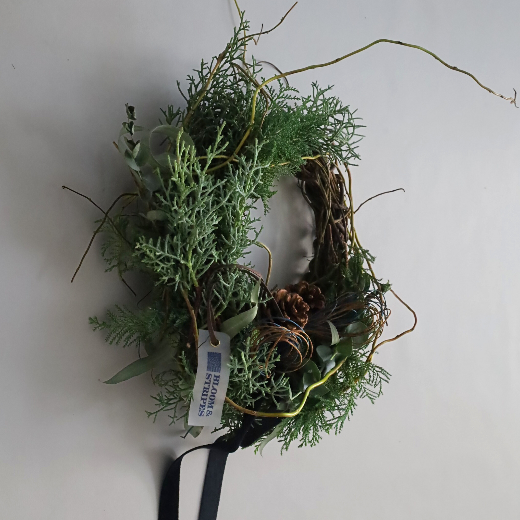 フレッシュな針葉樹が香る、BLOOM&STRIPESのクリスマスリース。自然素材をたっぷり束ねたナチュラルなデザインと、森のように清々しい香りで、お部屋をそっとクリスマス仕様に。