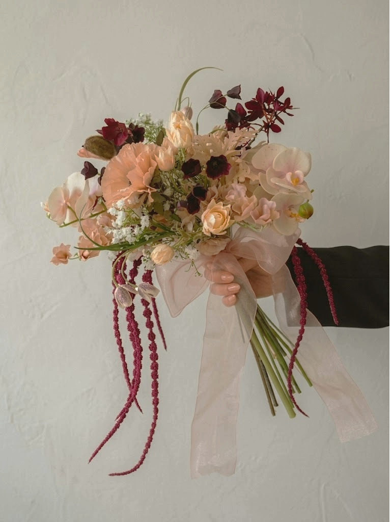今人気のクラッチブーケをベースに、ふわふわと軽やかなエアリー感を纏わせたスタイル。