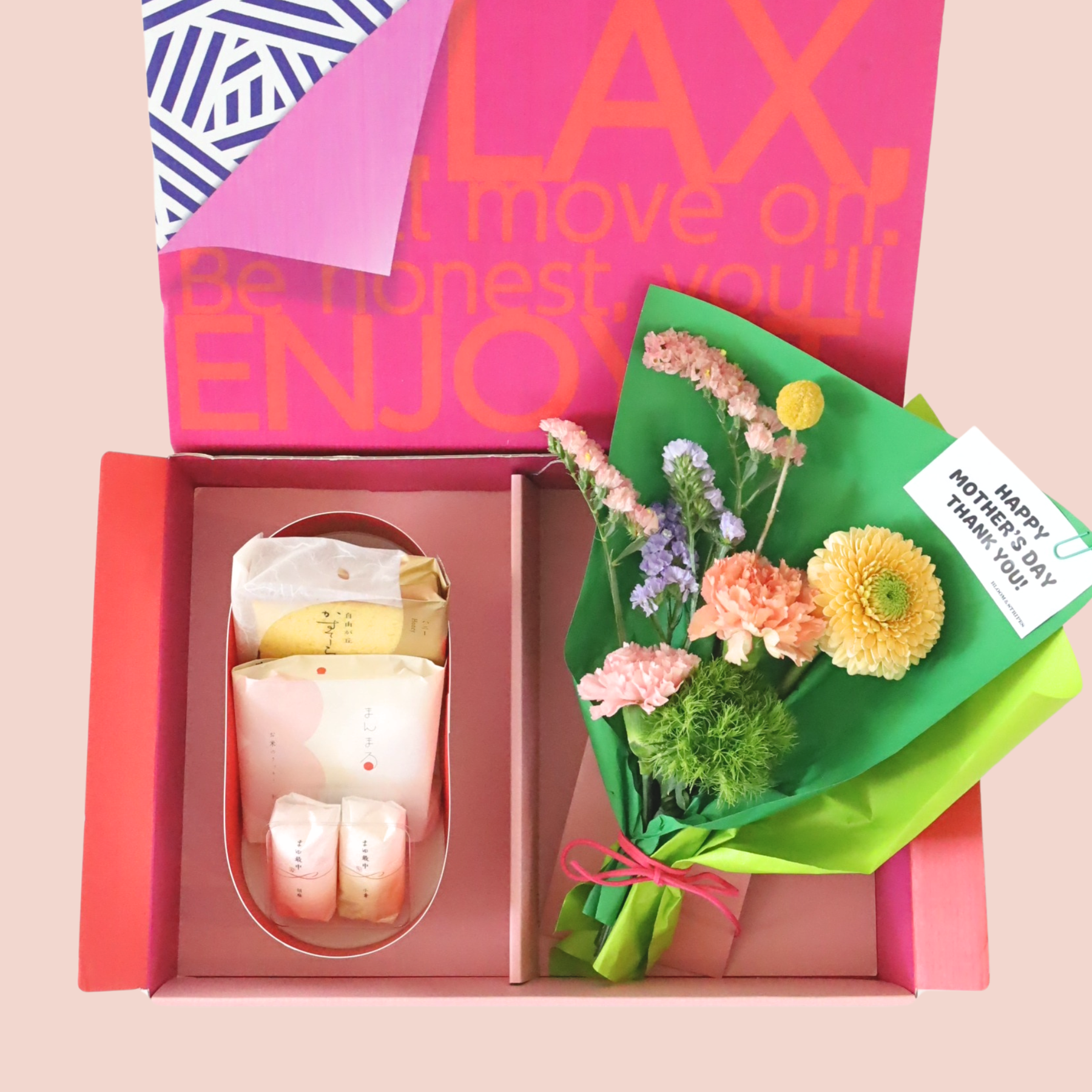 BLOOM&STRIPESの花束と、蜂の家の人気和菓子を組み合わせました。