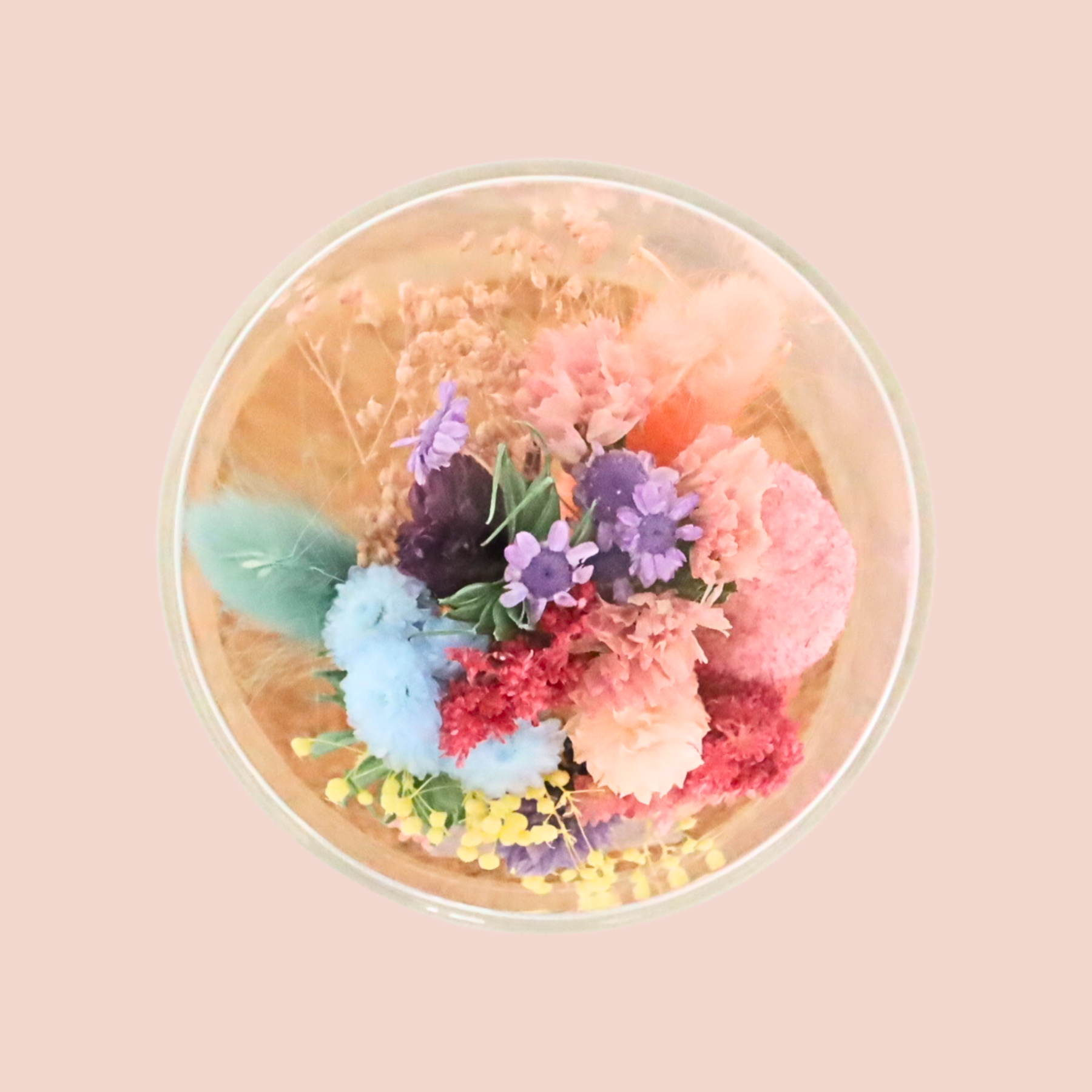 手のひらサイズの小さな花束を、ガラスドームに閉じ込めました。