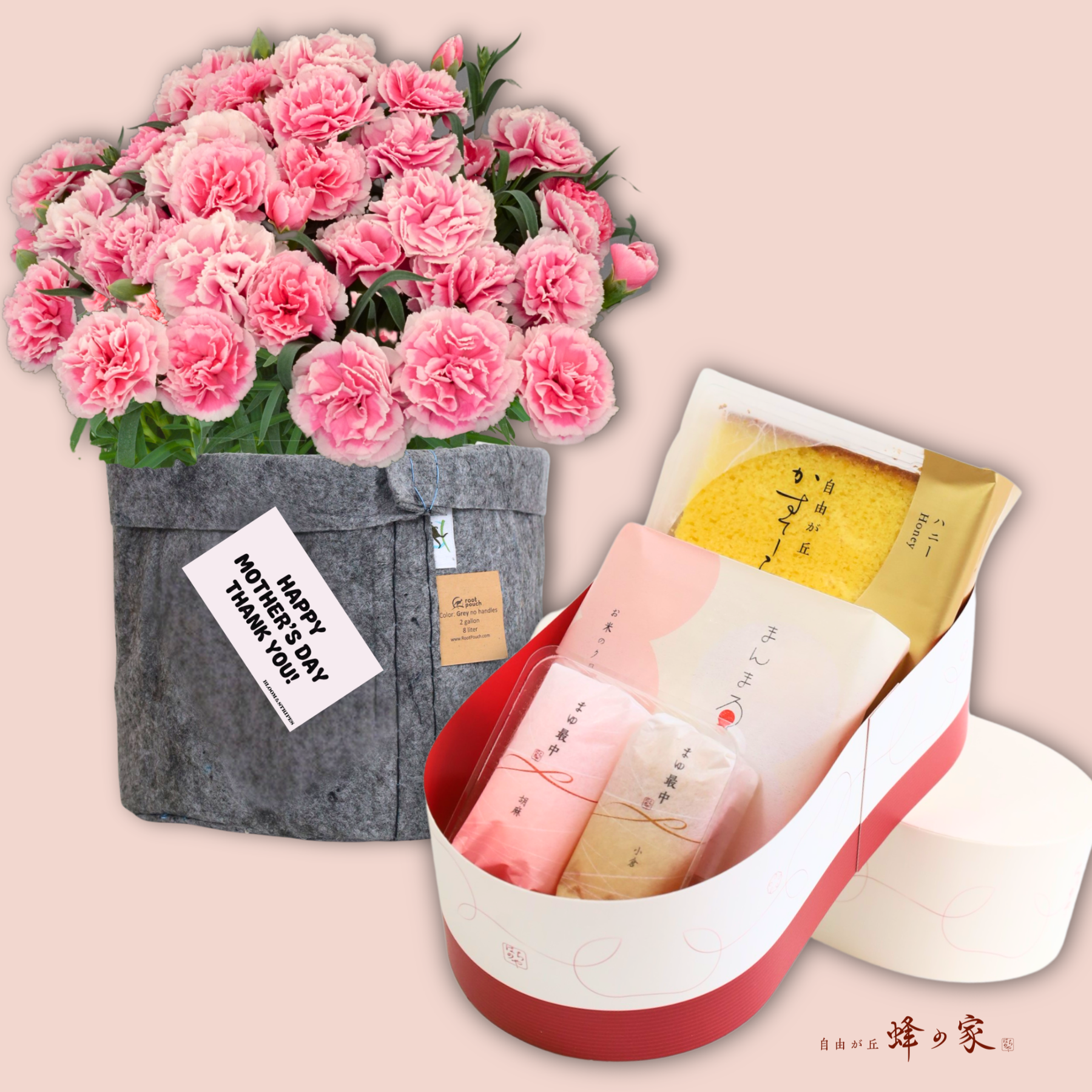 厳選されたカーネーションの鉢植えと、蜂の家の人気和菓子を組み合わせました。